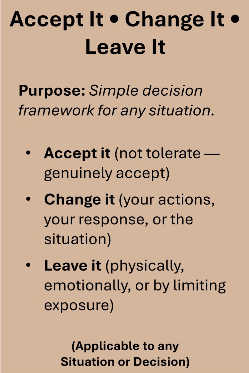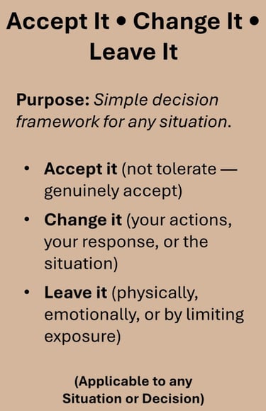 Some information may reference or be informed by external sources or authors. All services and materials are designed to clarify concepts and distill options to help individuals think more clearly about their own situations. All decisions and actions remain the responsibility of the individual. Use your own judgment and discretion.